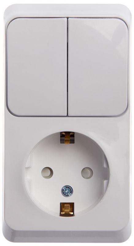 Блок Systeme Electric (ранее Schneider Electric) ЭТЮД (белый, открытой установки) предназначен для применения в сетях до 250В, состоит из розетки на 16А с заземлением и шторками и двухклавишного выключателя на 10А. Две клавиши позволяют управлять двумя источниками света с одной точки. Он удобен в применении и отлично подходит для коридора. Сделано в России.