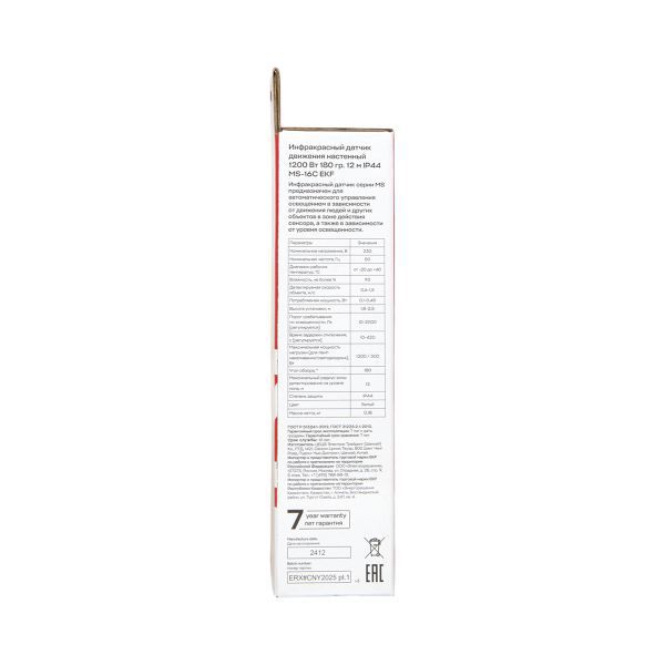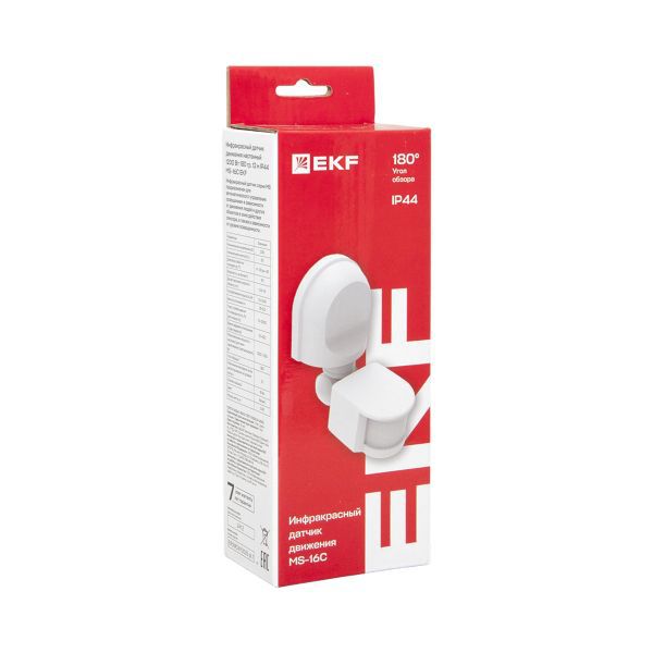Датчик движения инфракрасный MS-16C предназначен для экономии электроэнергии за счет автоматического управления освещением и другими инженерными системами. Датчик реагирует на движение людей и других объектов в зоне действия сенсора, принцип работы датчика основан на отслеживании уровня ИК-излучения в поле зрения. Датчик MS-16C предназначен для установки на стену накладным способом. Сенсор датчика имеет регулируемый в 2ух плоскостях поворотный механизм, что позволяет нацелить его на необходумую зону. Рекомендуется использовать датчик в корридорах, подъездах, различных проходных зонах. Возможно использование на улице под навесом. Алгоритм работы: при возникновении движения в поле зрения датчика встроенное электромеханическое реле (рассчитано на полную мощность 1200Вт) коммутирует подключенную нагрузку. После этого нагрузка находится под напряжением в течение заданного времени (от 10 сек. до 7 минут, время настраивается) и выключается. Дополнительно датчик имеет функцию контроля освещенности.