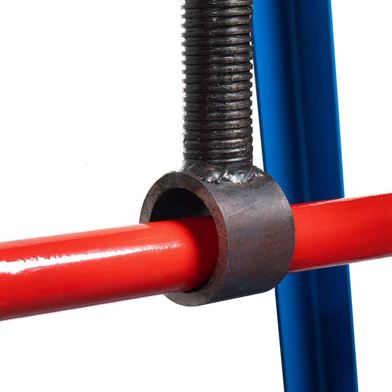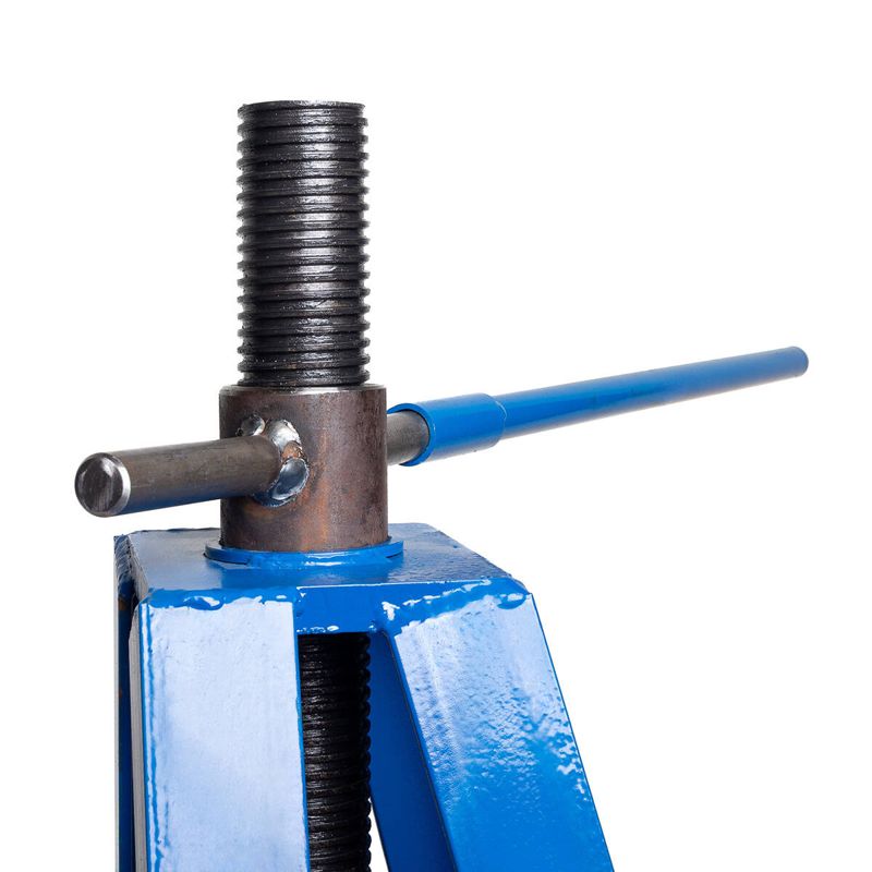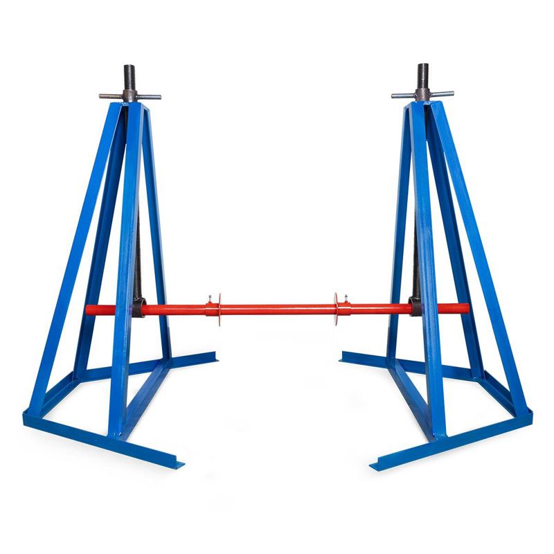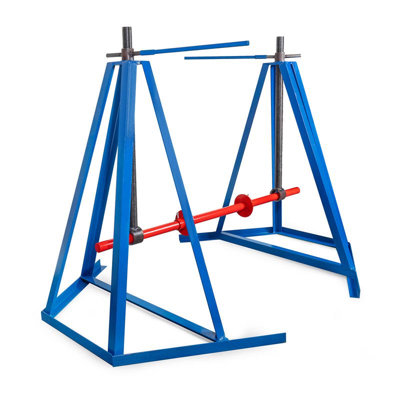 • Домкрат винтовой предназначен для подъема кабельных барабанов и удержания их на весу для размотки • Ось домкрата выполнена из цельнометаллического прутка и оснащена прижимными башмаками для предотвращения перемещения барабана по валу во время размотки кабеля • Конструкция домкрата выполнена из стального равнополочного уголка 50х50х5 мм • Максимальный допустимый вес барабана: 5 т • Размеры барабанов: от №8 до №22 • Комплект поставки: • Две вертикальные сварные стойки с основанием • Ось O 48 мм длиной 1700 мм • Два прижимных башмака • Две винтовые тяги • Две гайки для регулировки высоты подъема • Два удлинителя рукояток регулировочных гаек • Винтовые тяги имеют трапецеидальную резьбу, устойчивую к нагрузкам • Габариты стойки в сборе (ДхШхВ): 1450х700х1300 мм • Вес домкрата в сборе: 114 кг