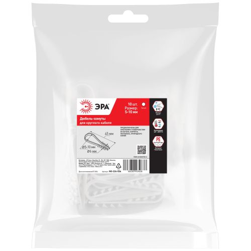 Дюбель-хомуты ЭРА предназначены для крепления круглых и плоских проводников, жестких и гибких труб на несущих строительных поверхностях, испытывающих статическую нагрузку. Могут быть установлены в любой материал: бетон, кирпич, дерево, ДСП, фанеру, газобетон и т.д., а также в стены, выполненные из пеноблоков и природного камня. Материал изделий - полиэтилен выского давления, благодаря чему они отличаются прочностью и рассчитаны на высокие нагрузки. Установка дюбель-хомута довольно проста. Достаточно лишь просверлить отверстие, соответствующее диаметру дюбеля, затем надеть дюбель на провод и вставить в отверстие, приложив небольшое усилие. Зубчики, находящиеся на дюбеле, упираются в стенки отверстия и обеспечивают надежную фиксацию, не позволяя крепежу выскользнуть из него даже при значительных усилиях. В ассортименте 2 типа изделий: для круглого и для плоского кабеля. Особенности изделий: - Быстрый монтаж без дюбелей и шурупов. - Надежная фиксация проводника в стене благодаря увеличенным зубьям. - Материал: полиэтилен выского давления, не поддерживает горение.