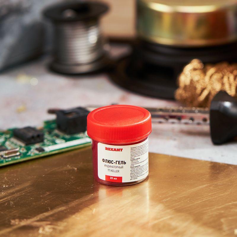 Флюс-гель TT индикаторный REXANT применяется для высококачественной пайки электронных компонентов, радиотехнических изделий и посадки SMD-компонентов. Подходит для пайки практически всех металлов и сплавов. В состав входит красный индикатор активности, который после пайки обесцвечивается, свидетельствуя об отсутствии активного компонента в месте пайки. По завершении работ остатки флюса предохраняют паяный шов от коррозии, поэтому смывка остатков не рекомендуется. При необходимости остатки флюса можно удалить уайтспиритом, растворителем №646 или горячей водой. Температура наибольшей активности: +170...+250 ?. Основные компоненты: вазелин технический, тетраэтиленгликоль, эмульгатор и термокраситель. Вариант фасовки – банка объемом 20 мл.