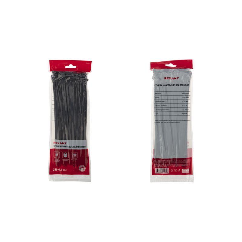 Нейлоновый хомут (кабельная стяжка) REXANT представляет собой черную гибкую полоску из полиамида с замковым механизмом одностороннего действия. Используется для крепления или соединения в жгут проводов, кабелей и любых разновидностей труб. Прочность, эластичность и простота монтажа позволяют использовать их на предприятиях и в быту. Нейлоновая стяжка REXANT отличается надежной фиксацией, прочностью и устойчивостью к внешним воздействиям. Изделие является экологически чистым продуктом, не содержит галогенов. Установка может быть выполнена вручную или с помощью специального пистолета. По окончании работ излишки длины обрезаются. Не рекомендуется перегибать изделие более чем на 90° при монтаже или хранении. В упаковке поставляются 100 стяжек размером 250x4,8 мм.