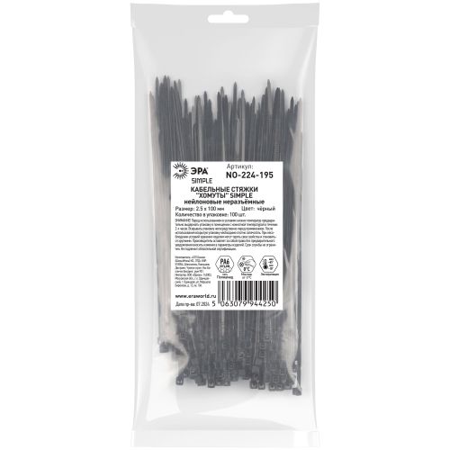 Нейлоновые хомуты (кабельные стяжки) ЭРА SIMPLE обладают неразъёмным замковым механизмом одностороннего действия. Используются для крепления или соединения в жгут проводов, кабелей и любых разновидностей труб как внутри помещений, так и снаружи. Прочность, эластичность и простота монтажа позволяют использовать их на предприятиях и в быту. При производстве хомутов черного цвета добавляется угольный порошок, что повышает устойчивость изделий к УФ-излучению. Хомут прост в применении, его можно крепить руками или с применением спец инструмента. Обеспечивает оперативность при монтаже и гарантирует надёжную фиксацию предметов. Особенности изделий: - Замковый механизм одностороннего хода. Неразъемный - Материал: Полиамид 6 не поддерживает горение, не содержит галогенов по UL94V2. - Повышенная рабочая нагрузка за счет применения технологии горячеканального литья. - Диапазон рабочих температур от -10 до +65 градусов Цельсия - Температура монтажа: от 0°C до +50°C