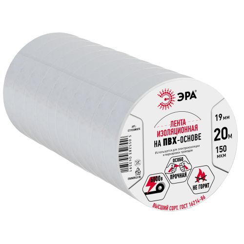 Изолента ЭРА из ПВХ 19мм х 20м предназначена для маркировки и изоляции проводки. Применяется при монтаже электрический сетей и подключении электрооборудования. Позволяет надежно изолировать и защитить цепь от влаги и пыли, препятствует возникновению короткого замыкания и возгорания. Рекомендуется для использования в ограниченном или труднодоступном пространстве. Высший сорт, соответствует ГОСТ 16214-86. - Удлинение при разрыве 190% - Удобный и комфортный монтаж - Устойчива в UV- лучам, влажности, истеранию - Самозатухающаяся Состав: поливинилхлорид, каучуковый клеевой слой. Тиснение лого ЭРА по всей длине изоленты подтверждает оригинальность товара. Можете быть уверены в качестве ленты и выполненных работ
