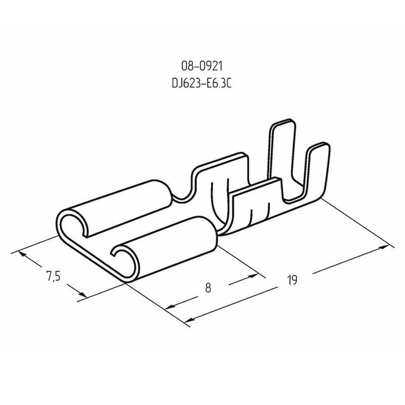 Клемма плоская (КП гнездо - 7.5 мм) 1-2.5 мм2 (DJ623-Е6.3С) REXANT предназначена для создания качественного подключения электрооборудования или соединения проводов между собой, которое при необходимости возможно разъединить без лишних усилий. Такая клемма используется для оконцовывания многожильных медных проводов при монтаже мобильных электрических контактных соединений на подвижном составе (автомобиле-, вагоно-, самолето- и судостроении). Клемма плоская не изолированная (гнездо) REXANT изготовлена из латуни. Обжатие производится специальными пресс-клещами (ht-202; ht-230; ht-301) по жиле и по изоляции, что обеспечит максимальную прочность соединения с проводом. Каждая клемма имеет фиксатор для более прочного механического соединения с штекерным разъемом. Основные характеристики: Температурный диапазон эксплуатации: -55...+135 ? Сечение применяемых проводов в диапазоне: 1-2.5 мм2 Общая длина штекера: L = 19 мм Рабочая ширина гнезда: W = 7.5 мм Применение плоских клемм дает возможность существенно ускорять электромонтажные работы, при этом появляется возможность неоднократного отсоединения и присоединения проводов.