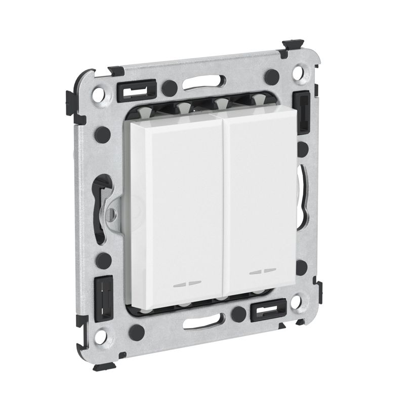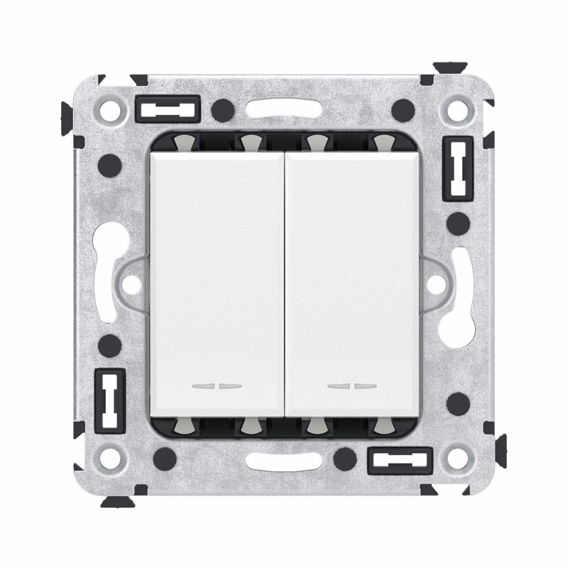 Кнопка двухклавишная. Назначение: для монтажа в подрозеточные коробки глубиной не менее 45 мм (код 59301). Используется в качестве кратковременного включения источника питания энергией. Характеристики: 2 модуля, диаметр отверстий для ввода кабелей – 3 мм (по 2 отверстия на одну клемму); винтовые зажимы; шаблон для зачистки кабеля – 11 мм; номинальный ток – 10 A; номинальное напряжение – 230 В; фиксация в подрозеточные коробки при помощи каркаса с лапками (код 4400802) и саморезов. Цвет: "Белое облако". Производитель оставляет за собой право вносить во внешний вид изделия изменения, которые не влияют на его функционал, безопасность и надежность.