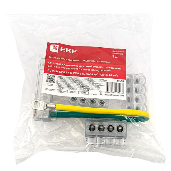 Набор клеммников уличного освещения типа sv-15 предназначен для соединения и разветвления 4-х или 6-и жильных кабелей внутри стоек или щитов опор и мачт уличного освещения. Подходит для медных и алюминиевых проводов. При подключении проводов необходимо зачистить концы от изоляции. Контакт с зачищенным проводом обеспечивается прижимными винтами с внутренним шестигранником. На проводящие части нанесена контактная смазка. Корпус клеммника неразборный. В комплект входит:ke-10.1 3шт., ke-10.3 1шт., заземляющий проводник 1шт.