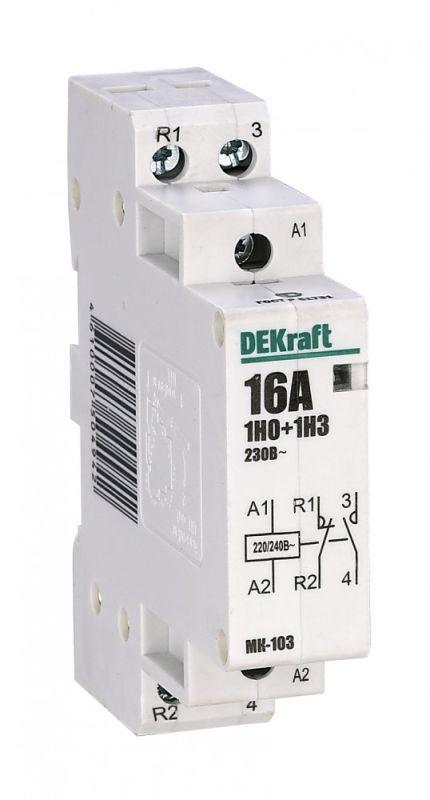 Модульный контактор серии МК-103 Dekraft; ном.ток 16 А (АС-7а); кол-во и исполнение контактов – 1НО+1НЗ; напряжение управления 220 В пер.тока; ширина – 1 мод. х 18 мм; установка – на DIN-рейку. Контакторы МК-103 применяются в сетях напряжением до 400 В пер.тока для дистанционного управления небольшими нагрузками, требующими большого количества включений / отключений, например, насосы, системы вентиляции и т.п. Модульные контакторы не требуют дополнительных настроек и специального обслуживания.