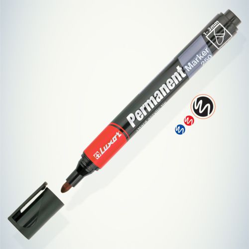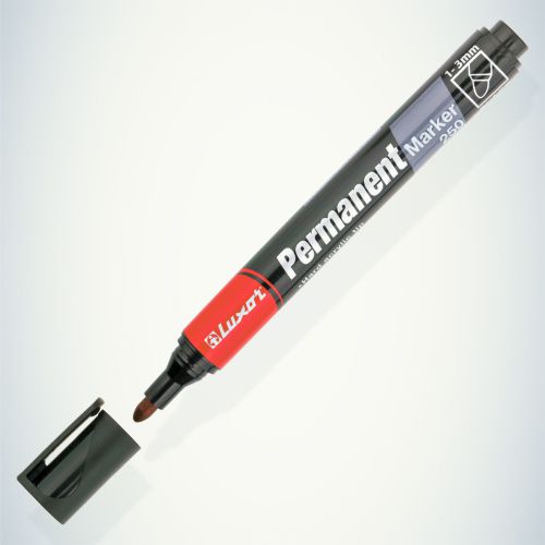 Перманентный маркер Luxor 250 - универсальное решение для маркировки на всех типах поверхностей: металл, дерево, резина, бетон, камень, кирпич, стекло, пленка, картон. Чернила несмываемого маркера устойчивы к климатическим изменениям: дождь, туман, солнце, не стираются и не выцветают в течение длительного времени, оставляют четкую и однородную линию, безопасны для использования и не содержат ксилол и толуол. Чернила на спиртовой основе. Корпус маркера изготовлен из прочного пластика. Цвет чернил - черный, диаметр пишущего узла от 1- 3 мм. Упаковка: картонная коробка по 12 штук. Перманентный маркер Luxor – это сочетание точной и долговечной маркировки!