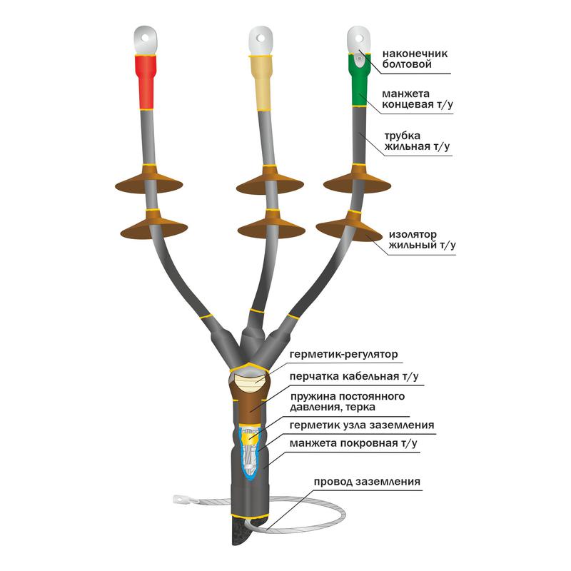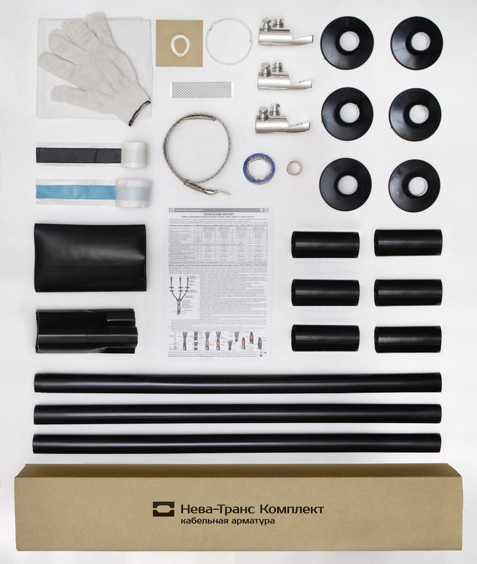 Муфта кабельная концевая марки 10КНТпН-3х(150-240) с болтовыми наконечниками наружной установки предназначена для оконцевания 3-х жильных силовых кабелей сечением 150, 185, 240 кв.мм с бумажной пропитанной изоляцией, с броней или без брони, на напряжение до 10 кВ включительно. Устанавливается на открытом воздухе. Эксплуатируется при температуре окружающей среды от -50°C до +50°C и относительной влажности до 98%. Соответствует требованиям ГОСТ 34839-2022 и ТУ 3599-012-31930690-2016. Прошла комплекс независимых испытаний в аккредитованных лабораториях, на основании которых выданы сертификаты соответствия требованиям ГОСТ, ТУ, пожарной и экологической безопасности. Монтируется на разделке кабеля путем термоусаживания деталей из модифицированного полимера с помощью газовой горелки или высокотемпературного фена. Универсальные болтовые наконечники со срывными головками, входящие в комплект кабельной муфты, подходят для кабелей как с алюминиевыми, так и с медными жилами. Комбинированный комплект заземления предусматривает крепление провода заземления к металлической оболочке кабеля с применением роликовой пружины постоянного давления и контактной терки, а к бронелентам - методом пайки. Обладает необходимым уровнем трекингостойкости, устойчивостью к ультрафиолетовому излучению и воздействию погодно-климатических факторов. Сочетает простоту монтажа и высокую эксплуатационную надежность. Срок службы - не менее 30 лет.