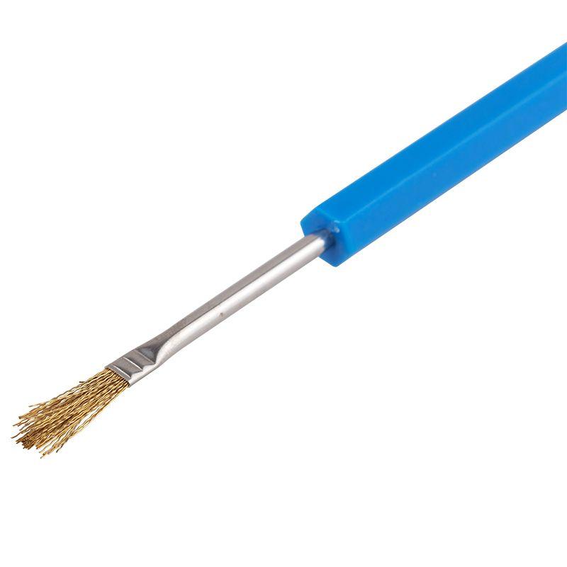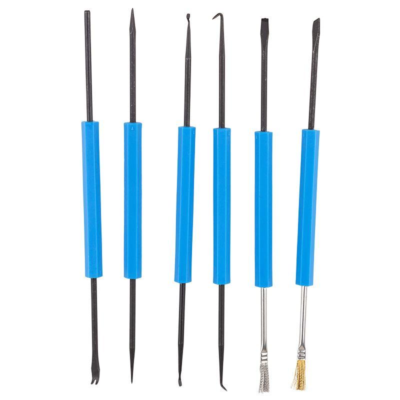 Набор для пайки (6 предметов) REXANT предназначен для монтажных и ремонтных работ с радиоэлементами на платах, в корпусах аппаратуры, в часовых механизмах и т. п. Используется в электронике, моделировании и ювелирном деле. Ручки из качественной пластмассы не растворяются в отмывочных жидкостях. В набор входит: Прижим — служит для удержания или прижимания различных элементов (резисторов, конденсаторов, микросхем и т.п.). Вилка — служит для удаления радиоэлементов с платы, вывод выдергивается при нагреве его паяльником. Другим концом можно закручивать кольца, захватывать пазом конец вывода. Крючок — предназначен для укладки тонких проводников и правильного расположения их на плате при монтаже. Шабер — нож предназначен для зачистки поверхностей от окислов и остатков припоя и флюса, а также для подрезки и зачистки проводов, дорожек на плате, удаления защитного покрытия. Шило — с одного конца цилиндрическое, с другого — 4-гранное, служит для прочистки и расширения отверстий в платах. Кисточка — для удаления остатков припоя, флюса, очистки поверхностей от окислов (бронзовая и из нержавеющей стали).
