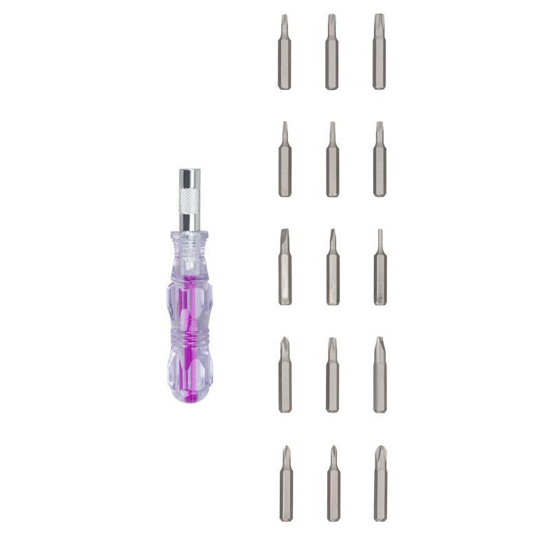Набор отверток для точных работ арт. 12-4704 REXANT 16 предметов предназначен для выполнения прецизионных работ в электронике и электромеханике. Эргономичная прозрачная двухкомпонентная рукоятка отвертки делает работу с инструментом легкой и удобной. Биты набора выполнены из хромованадиевой стали. Магнитный держатель обеспечивает быструю замену и надежную фиксацию насадок. Набор поставляется в пластиковом боксе и содержит 16 предметов: Отвертка 1 шт. Биты 15 шт. (PH00, PH0, PH1, PH2, T5, T6, T7, T8, T9, T10, T15, U4, ?, SL2, SL3).