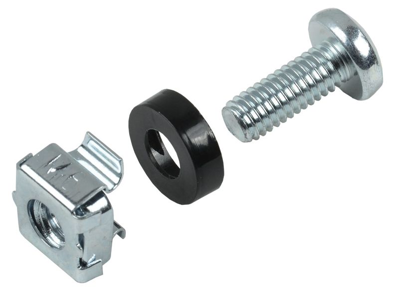 Набор винт-шайба-гайка необходим для крепления оборудования на монтажные профили шкафов и стоек. Гайки в наборе имеют квадратную форму и специальные "лапки", прочно фиксирующие их в квадратном отверстии монтажных профилей, что облегчает установку оборудования, т.к. нет необходимости держать гайку руками. Также в наборе предусмотрены пластиковые шайбы, предотвращающие повреждение оборудования при затягивании винтов в гайку.