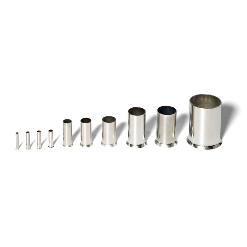 • Предназначены для оконцевания методом опрессовки многожильных медных проводников. Трансформируют концы многожильных проводов в монолитные штифты • Размеры втулок НШВ рассчитаны для монтажа одного проводника соответствующего сечения. Однако, поскольку пластмассовая ограничительная манжета отсутствует, втулки могут быть также использованы для соединения двух и более проводников • Завод жилы во втулку осуществляется со стороны раструба • Материал коннектора: медь марки М1 • Покрытие: электролитическое лужение • Температурный диапазон эксплуатации: от -55 °C до +135 °C • Благодаря расширенному температурному диапазону, наконечники НШВ рекомендованы к применению для проводов с термостойкой изоляцией из кремний-органической резины марок ПРКА, ПРКС, ПВКВ, РКГМ • Втулки без манжеты незаменимы для оконцевания проводов с толстой изоляцией (например, кабелей с резиновой изоляцией КГ и КОГ) • Наконечники НШВ представлены со стандартной длиной втулки. Под заказ возможно исполнение наконечников НШВ с увеличенной длиной втулки