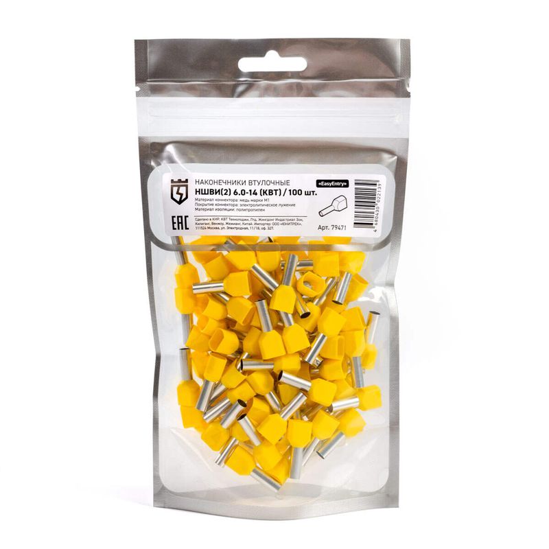 • Для монтажа сдвоенных проводов одинакового сечения • Предназначены для оконцевания методом опрессовки гибких многопроволочных медных проводников. Трансформируют концы многожильных проводов в монолитные штифты • Современная альтернатива обязательному облуживанию концов многожильных проводников при подсоединении к клеммам • Размеры изолированных манжет и втулок наконечников НШВИ(2) рассчитаны для монтажа и подключения двух проводников • В условиях высокой плотности монтажа двойные втулочные наконечники являются единственно возможным контактным соединением двух проводников • Материал коннектора: медь марки М1 • Покрытие коннектора: электролитическое лужение • Материал изоляции: полипропилен. Не содержит галогенов • Термостойкость изоляции: 105 °C • Цвет изолирующих манжет выполнен в соответствии с цветовой маркировкой DIN 46228, часть 4 • Одинарные и двойные втулочные наконечники «КВТ» представлены в одинаковой цветовой гамме стандарта DIN, что облегчает их поразмерную идентификацию • Коническая форма манжеты, тип «Easy Entry», облегчает заведение многожильного провода внутрь медной втулки • Обжим провода поверх медной втулки