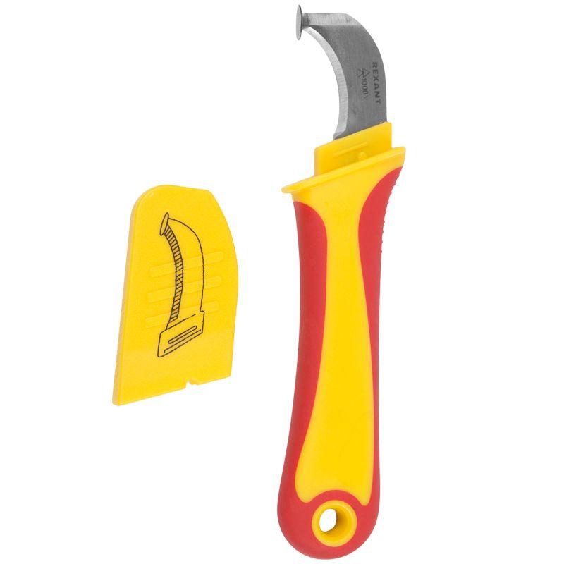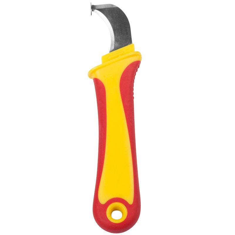 Монтажный нож предназначен для удаления изоляции с многожильного кабеля и других электромонтажных работ. Усиленное лезвие со прецизионной двухсторонней заточкой подходит для работы с толстыми материалами, изготовлено из нержавеющей стали, благодаря чему защищено от коррозии и имеет продолжительный срок эксплуатации. Кончик ножа оснащен "пяткой" - ограничительной пластиной - для качественного снятия оболочки без риска повредить жильную изоляцию. Изогнутая форма лезвия делает нож удобным для работы в труднодоступных местах. Мощная противоскользящая двухкомпонентная рукоятка изготовлена из мягкого пластика и гарантирует комфорт и безопасность во время работы. Для удобного хранения и транспортировки ножа предусмотрены пластиковые ножны.