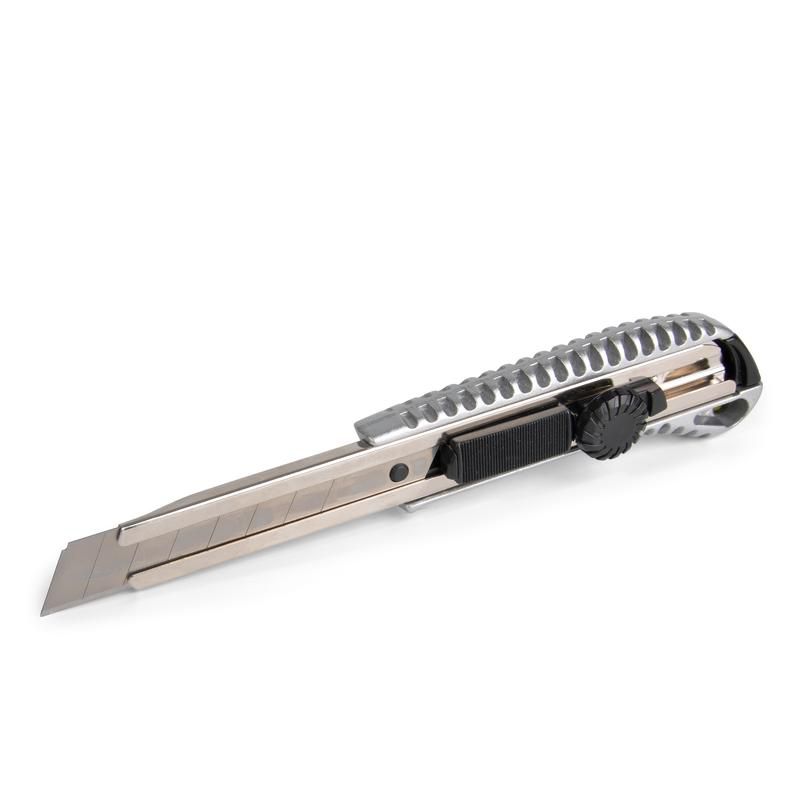 • Предназначен для резки тонких строительных материалов (бумага, картон, пластик, резина и т.д.) • Выдвижное секционное лезвие • Ширина лезвия: 18мм • Материал лезвий: инструментальная сталь • Трещоточный фиксатор лезвия • Механизм автовозврата лезвия • Никелированные направляющие из нержавеющей стали • Эргономичный корпус из легкого сплава с нескользящими вставками • Корпус оснащен отверстием для подвешивания • Вес: 108г • Длина: 200мм
