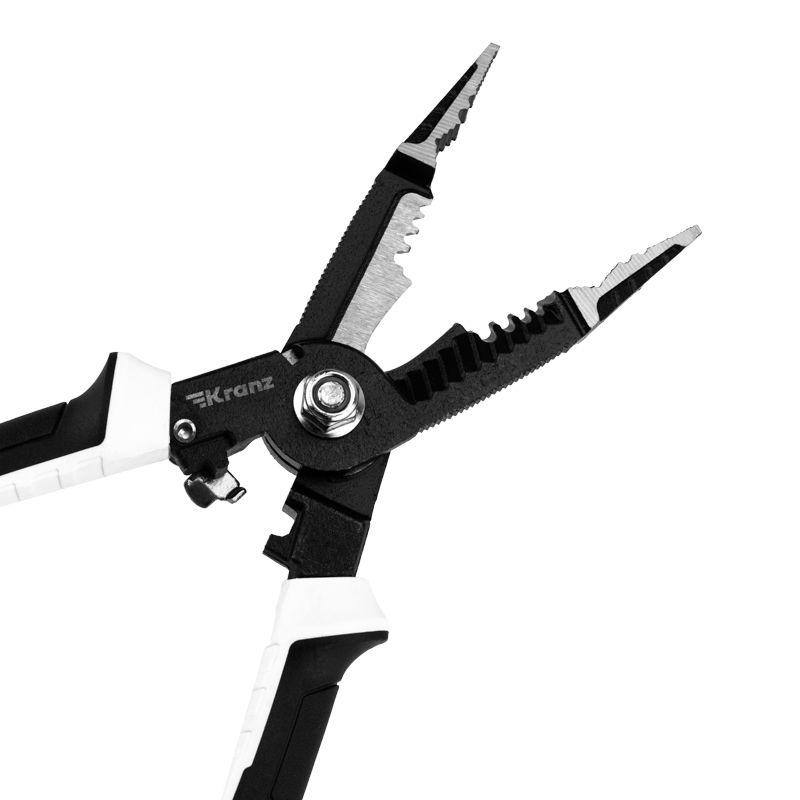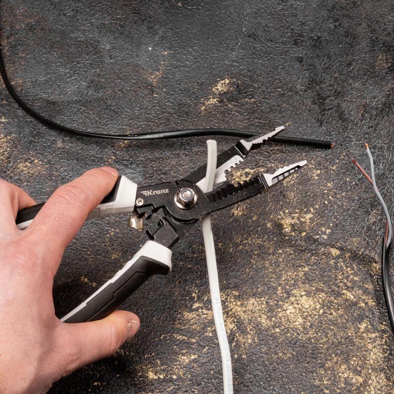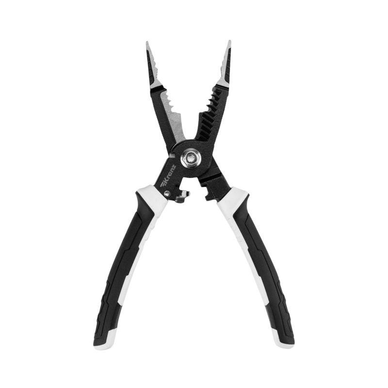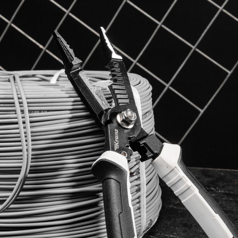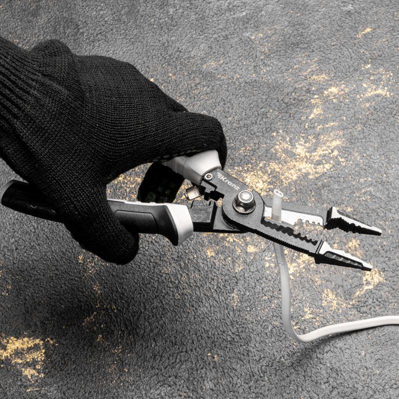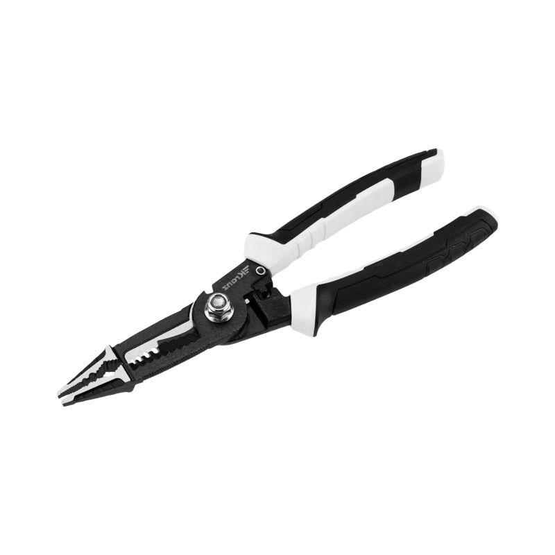 Многофункциональные универсальные плоскогубцы – это инструмент на все случаи жизни, включающий в себя: плоскогубцы, тонкогубцы, бокорезы, инструмент для зачистки кабеля, резак для проводов, напильник, инструмент для обжима клемм. Используются для ремонта автомобилей, мотоциклов, механизмов и т.д. Применяются для монтажных работ, а также в быту. Плоскогубцы изготовлены из профессиональной хромованадиевой стали (60Cr-V), максимальная твердость – 60-62HRC. Оснащены износостойкими двухкомпонентными анатомическими рукоятками, которые не скользят в руках. Тип рукояток – японский. На торцах плоскогубцев расположены насечки, позволяющие использовать инструмент как напильник для тяжелых работ. Плоскогубцы обладают отличной режущей способностью, подходят для резки/зачистки пластика, медных и мягких проводов, а также для обжима изолированных и неизолированных наконечников. Также подходят для зачистки кабеля от 1,27 мм2 до 5,30 мм2.