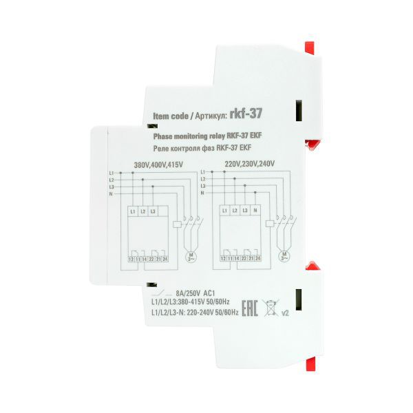 Реле контроля фаз RKF является механическими коммутационным аппаратом, который предназначается для контроля уровня напряжения в трехфазных сетях переменного тока и защитного отключения нагрузки в случае падения или повышения напряжения электрической сети сверх допустимого значения, а также в случае обрыва фазы, неверной последовательности фаз и асимметрии. Данные реле отличаются компактными размерами и универсальностью применения в трех- и четырехпроводных схемах. Реле контролирует следующие параметры: отсутствие фаз, падение напряжения, повышение напряжения, асимметрия напряжения с выдержкой времени срабатывания, чередование фаз.