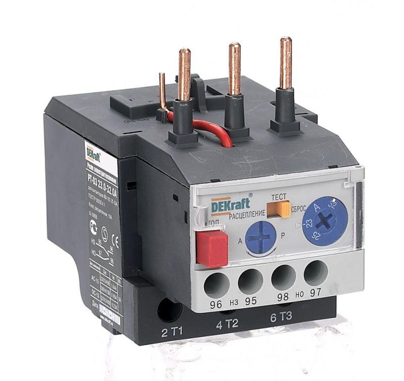 Тепловое реле перегрузки серии РТ-03 Dekraft; предназначено для применения с контакторами КМ-103 на ток 25-32 А; трехполюсное; диапазон уставок реле 23-32 А; класс расцепления 10А; два режима повторного включения - ручной и автоматический. Тепловые реле РТ-03 применяются для защиты цепей переменного тока и электродвигателей от перегрузки, асимметрии фаз, затянутого пуска и заклинивания ротора. Реле подходит к соответствующим контакторам других производителей.