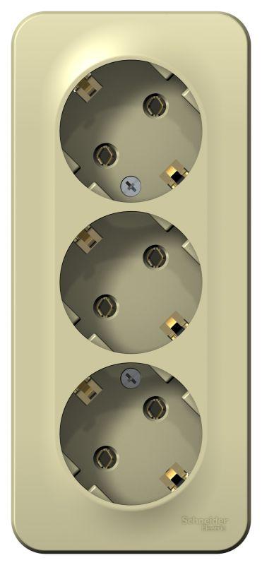 Розетка Systeme Electric (ранее Schneider Electric) BLANCA (открытой установки, цвет бежевый) трёхместная с заземлением без шторок, с изолирующей пластиной подходит для сетей 250 В, на ток 16 А. Заземляющий контакт обеспечивает дополнительную защиту от удара электрическим током. Входные отверстия расположены под углом 45 градусов, благодаря чему можно подключить несколько устройств: вилки и адаптеры не будут мешать друг другу. Корпус изделия выполнен из ABS-пластика.