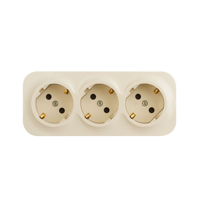 Тройная розетка с заземлением, со шторками QUTEO. Применяется в зданиях, оборудованных для повышения безопасности проводкой с заземлением (с защитным проводником). Рекомендуются к применению в помещениях в которых могут быть дети. Шторки осуществляют защитную функцию путём ограничения доступа к токоведущим контактам. Доступ открывается только при подключении вилки.