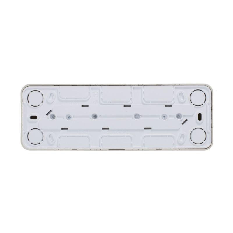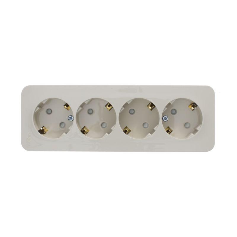 Розетка Systeme Electric (ранее Schneider Electric) BLANCA (открытой установки, цвет бежевый) четырёхместная с заземлением и шторками, с изолирующей пластиной подходит для сетей 250 В, на ток 16 А. Заземляющий контакт обеспечивает дополнительную защиту от удара электрическим током. При наличии заземления электрический потенциал уходит в землю, защищая человека. Входные отверстия расположены под углом 45 градусов, благодаря чему можно подключить несколько устройств: вилки и адаптеры не будут мешать друг другу. Корпус изделия выполнен из ABS-пластика.