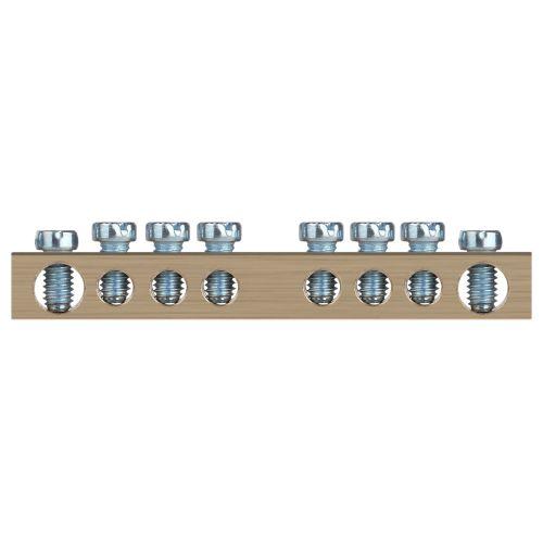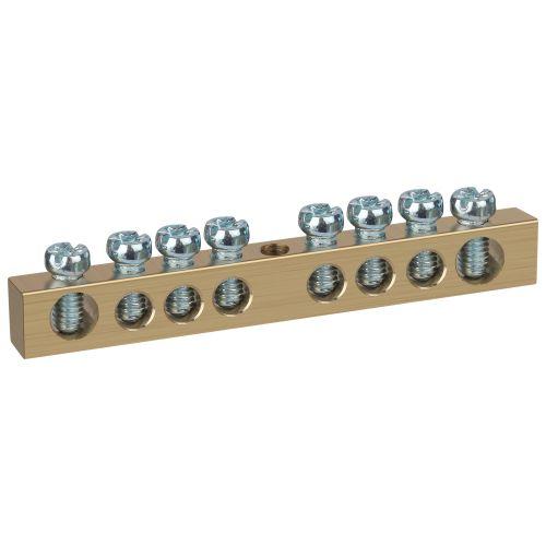 Шины латунные PEN "земля-ноль" применяются для электрического и механического соединения нулевых, защитных и фазных проводников в электрических щитах и распределительных устройствах. Изделия выполняются из латуни соответствующего сечения с отверстиями обладающими винтовыми зажимами для подключения проводников. Применение «нулевых» шин позволяет: - свести в одну общую группу все нулевые или заземляющие проводники, входящие и отходящие, - сократить количество проводников в щитке, что упрощает его обслуживание, - сэкономить пространство и без особых усилий размещать новые элементы, - обеспечить стабильное и долговечное соединение. Особенности конструкции изделия: - Материал: латунь Л56 - Сечение: 6х9 мм - Номинальный ток In: 100 А - Диаметр отверстия для присоединения входящих проводников: o 6 мм - Диаметр отверстия для присоединения отходящих проводников: o 4 мм - Прижимные винты изготовлены из оцинкованной стали и обладают скруглённой контактной частью, что исключает перекусывание и повреждение подключаемых проводников