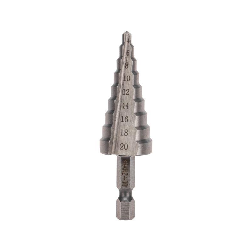 Ступенчатое сверло KRANZ применяется при выполнении монтажно-сборочных работ для сверления отверстий различных диаметров без перестановки режущего инструмента. Применяется в работе с такими материалами, как пластик, дерево, металл и др. Благодаря своей уникальной конструкции изделие заменяет целый набор традиционных спиральных сверл. Использование оснастки позволяет сэкономить время мастера, так как не требует предварительного кернения и сверления. Шестигранный хвостовик Е6,3 обеспечивает надежную фиксацию сверла во всех типах патронов шуруповертов и дрелей. Форма канавки – прямая. На каждой из 9 ступеней сверла нанесена маркировка фактического диаметра. Диапазон ступеней: 4, 6, 8, 10, 12, 14, 16, 18, 20 (шаг 2 мм). Сверло изготовлено из быстрорежущей инструментальной стали (HSS) и обладает высокой прочностью, а также устойчивостью к динамическим нагрузкам и перегреву.