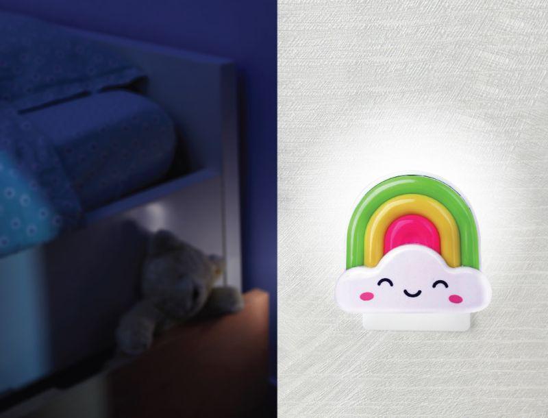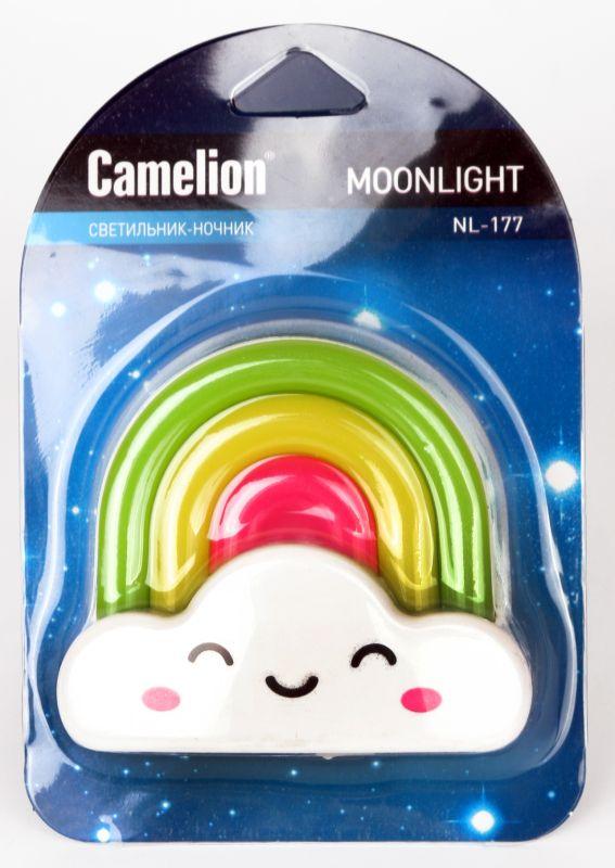 Светильник ночник предназначен для локальной подсветки в детских комнатах, спальнях, гостиных. Camelion NL-177 "Радуга", питание от сети 220В, размер 85х75х60мм, источник света - встроенные светодиоды, мощность 1Вт, кол-во светодиодов - 3, пластик.