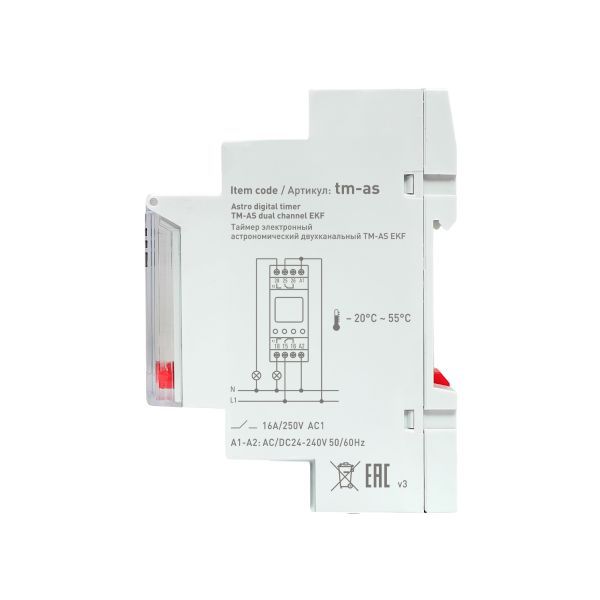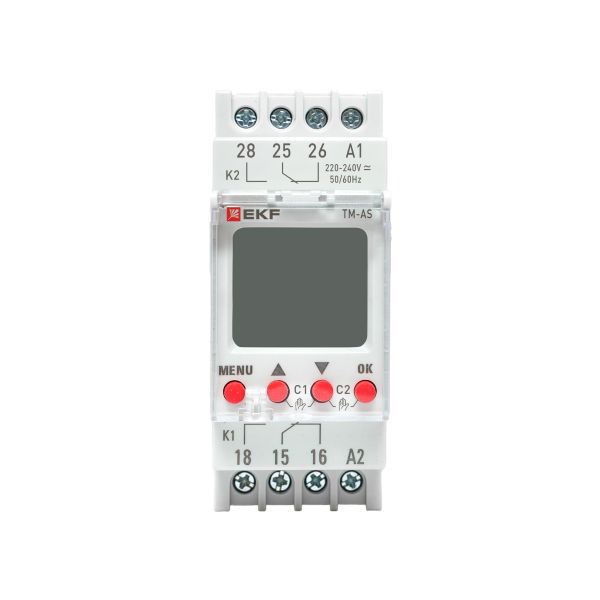Таймер астрономический TM-AS EKF PROxima представляют собой реле с двумя независимыми группами контактов, момент срабатывания которого (включение/отключение) происходит по времени заката и восхода солнца на основании координат местоположения. Таймер имеет возможность срабатывания (80 программ) по заданному времени и дню недели. Таймер имеет в составе часы, что позволяет отслеживать текущее время. Изделие соответствует ГОСТ IEC 60947-1-2014, ГОСТ IEC 60947-5-1-2014. Преимущества: 1. Автоматический расчёт времени заката и рассвета 2. Два независимых канала управления 3. Задание до 80 программ 4. Информативный дисплей 5. Часы реального времени 6. Защитная крышка дисплея и кнопок с возможностью опломбировки 7. Возможность регулировки предустановки интервала времени 8. Возможность ручного управления реле по каждому канала 9. Два встроенных перекидных реле С/О с номинальным током 16А 10. Напряжение питания 24-264 V АС/DC