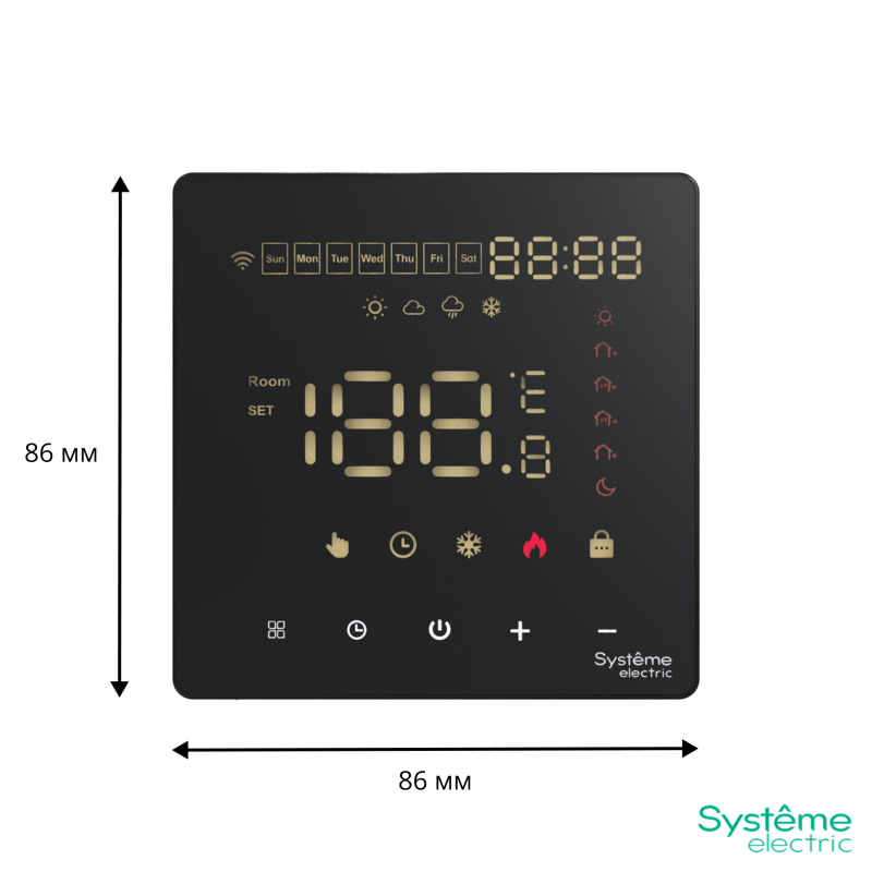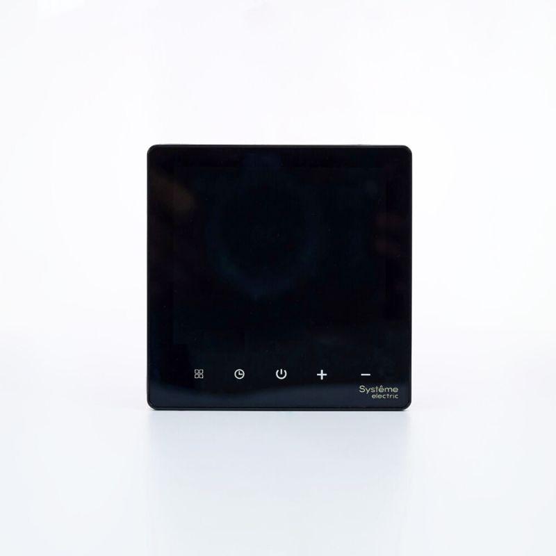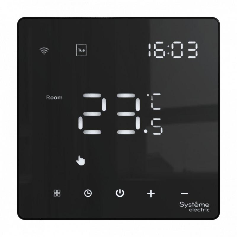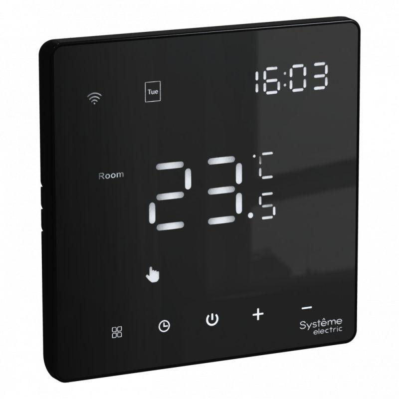 Термостат для электрического теплого пола Systeme Electric серии ArtGallery в цвете черный с Wi-Fi, 16 А Управлять теплым полом стало еще удобнее: • большой дисплей позволяет удобно сделать все настройки на самом устройстве; • можно установить расписание на неделю и включать теплый пол только утром и вечером; • два датчика: встроенный и выносной позволяют более точно регулировать теплый пол; • можно удаленно управлять теплым полом и включить его заранее по дороге домой.