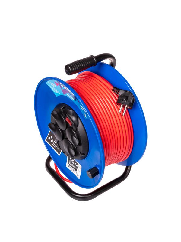 Удлинитель на катушке 50 метров на 4 гнезда с автоматическим предохранителем, с брызгозащитными крышками IP44 и заземлением. Кабель ПВС 3х1,5мм (с заземлением). Максимальная мощность подключения 3500 Вт. Удлинитель 16А подходит для мощных приборов, в том числе во влажных помещениях и при плохой погоде. Автоматический предохранитель выключит питание при опасном перегреве от нагрузки сверх допустимой нормы. Удачный выбор для профессионального строительства. Прочная стальная рама. Произведено в России.