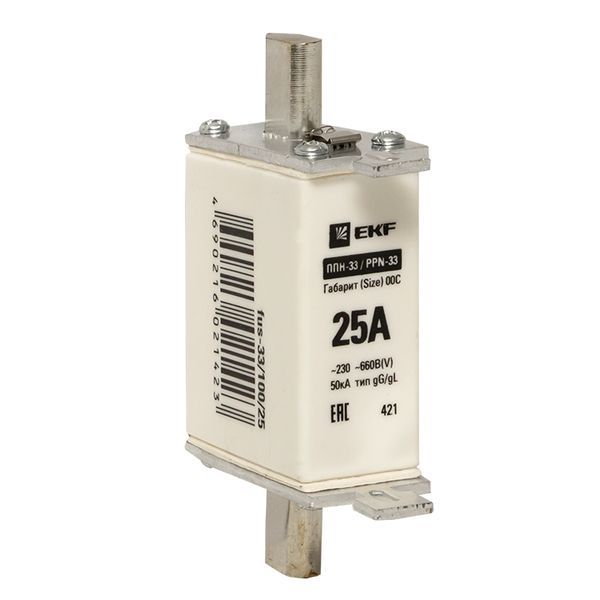 Плавкая вставка ППН-33 100/ 25А габарит 00С EKF. Предохранители плавкие ППН EKF, укомплектованные плавкими вставками типа gG/gL, предназначаются для защиты кабельных линий и промышленных электроустановок от токов перегрузки и короткого замыкания. Предохранители применяются в электрических сетях переменного тока частотой 50 Гц с напряжением до 660В. Применяются для крепления в распределительных и вводно-распределительных устройствах. Предохранители плавкие ППН могут устанавливаться в основание с держателем, а также в специально предназначенные рубильники. В комплект поставки предохранителей плавких ППН основание с держателем не входит и приобретается отдельно.