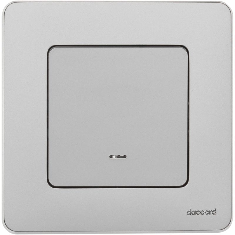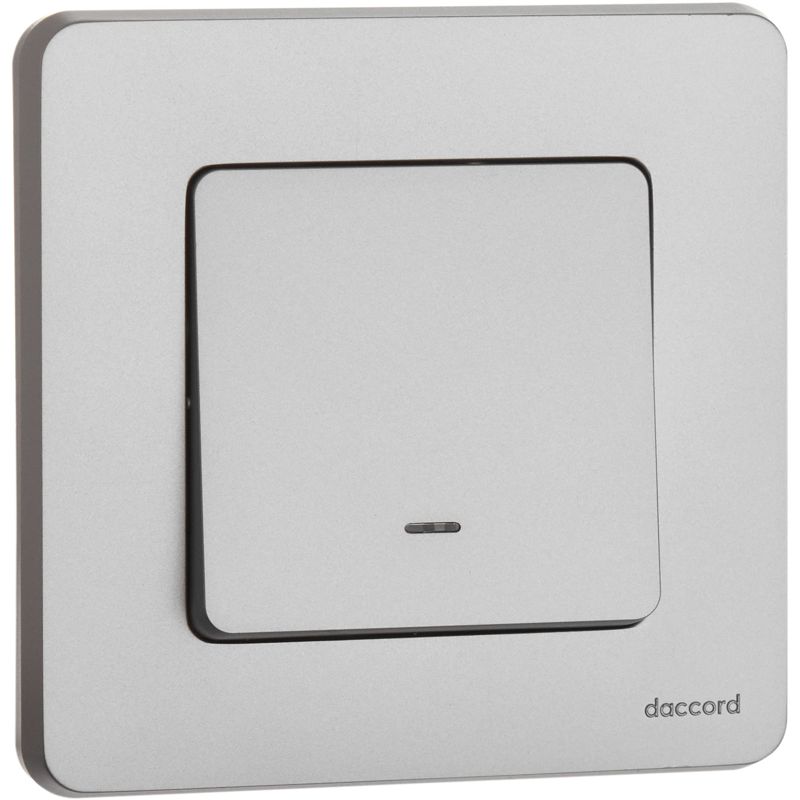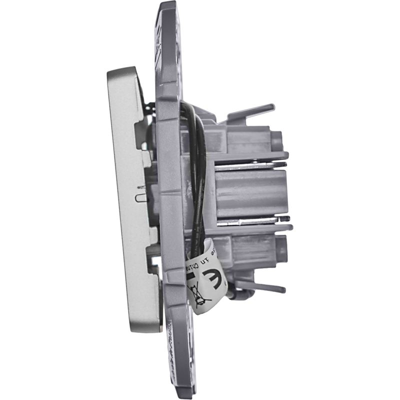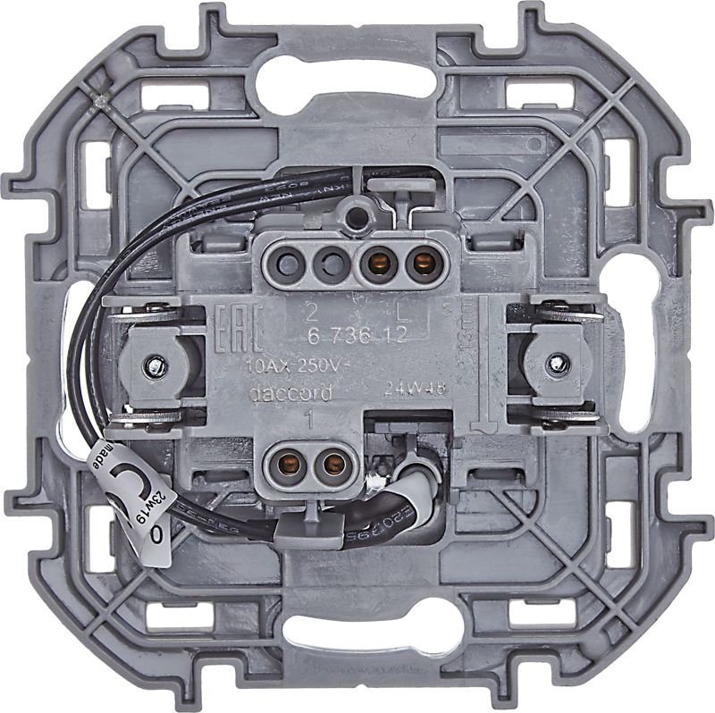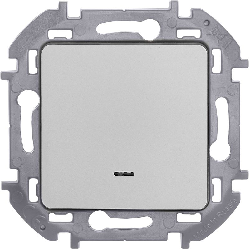 Выключатель одноклавишный с подсветкой/индикацией скрытого монтажа Inspiria, цвет "Алюминий", номинальный ток 10АХ, напряжение ~250В, безвинтовые зажимы. Устанавливается в жилых и общественных помещениях для управления приборами освещения, вентиляции и т.д.