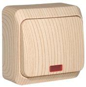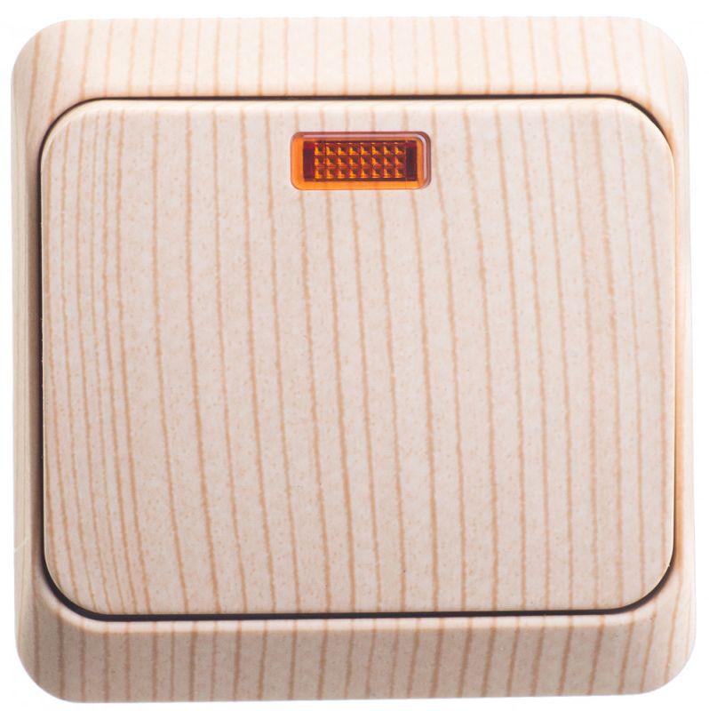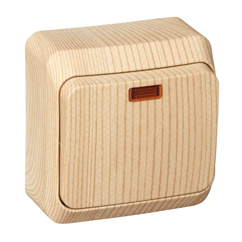 Выключатель Systeme Electric (ранее Schneider Electric) ЭТЮД (сосна, открытой установки) одноклавишный предназначен для применения в сетях до 250В, на ток до 10А. Наличие подсветки делает его легко находимым при отсутствии освещения. Выключатель подходит для большинства типов ламп, включая люминесцентные. Изделия цвета Сосна обладают уникальным рисунком, напоминающим древесный сруб. Сделано в России.