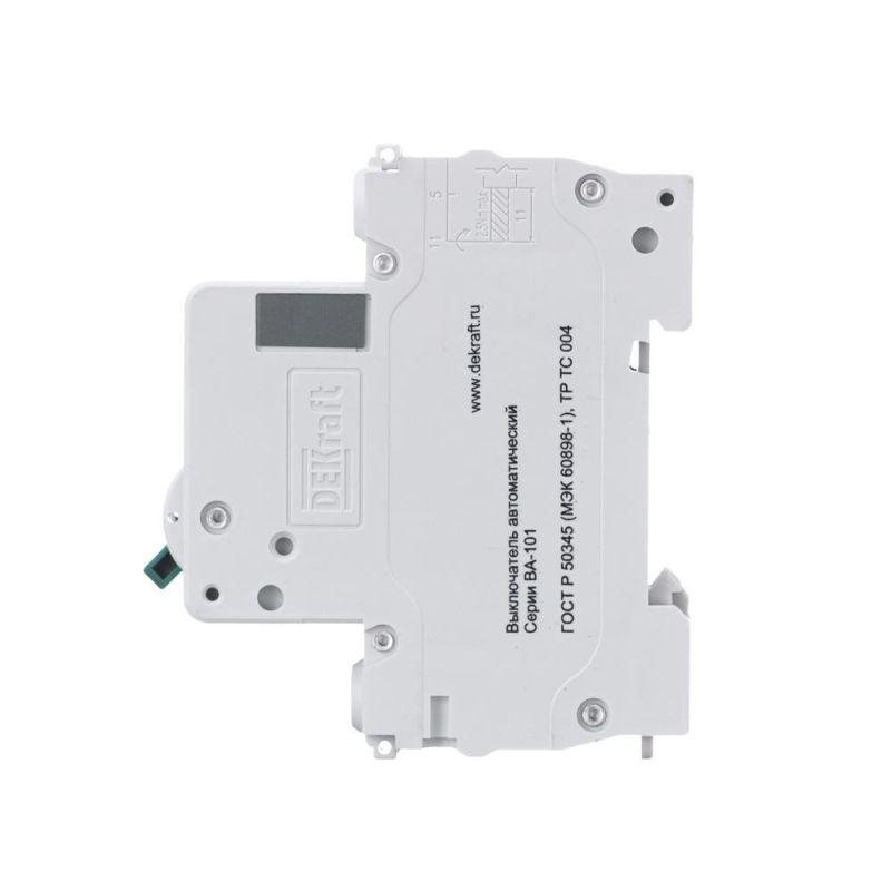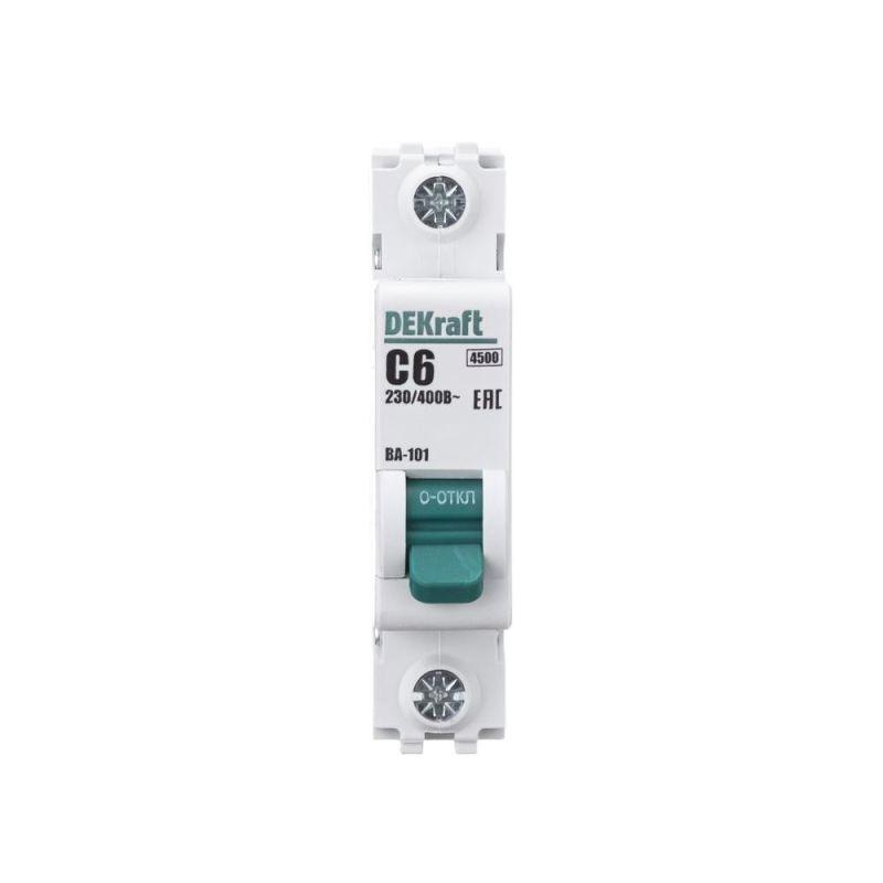 Автоматический выключатель серии ВА-101 Dekraft; 1P; номинальный ток 6 А; характеристика С; отключающая способность 4,5 кА. 5 монолитных заклепок повышают прочность корпуса аппарата. Сплошная лицевая панель обеспечивает безопасность эксплуатации аппарата. Боковые каналы охлаждения повышают стабильность работы при высоких температурах окружающей среды. Есть возможность установки дополнительных аксессуаров с левой стороны устройства. Аппарат на 100% совместим с корпусами Dekraft и Systeme Electric.