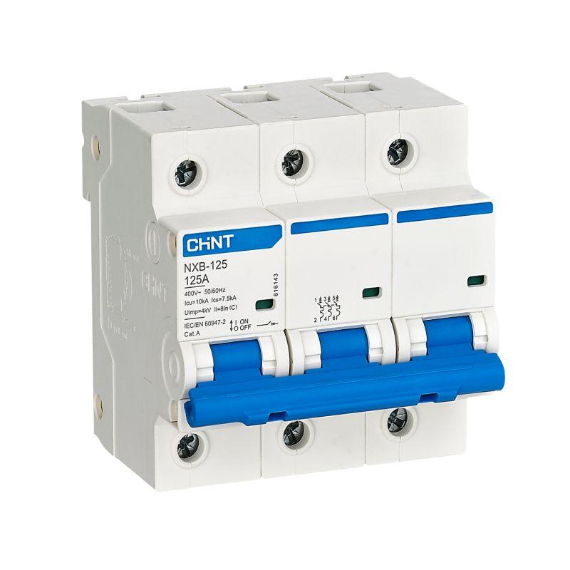 "Модульные автоматические выключатели серии NXB-125 предназначены для применения в сетях переменного тока напряжением 220/400 В частотой 50/60 Гц с номинальным током до 125 А для нечастых включений и отключений нагрузок, а также защиты от перегрузки и короткого замыкания в электроустановках жилых, общественных и промышленных зданий. Применимы в бытовых и аналогичных электроустановках, с доступом не обученного специально персонала. Основные характеристики: Номинальный ток – от 63 А до 125 А Исполнение по числу полюсов – 1P; 2P; 3P; 4P Тип характеристики мгновенного срабатывания – C(8In–20%), D(12In–20%) Предельная отключающая способность – 10000 А Рабочая отключающая способность – 7500 А Механическая износостойкость – 20000 циклов В/О Электрическая износостойкость – 10000 циклов В/О Категория применения – A Класс токоограничения – 3 Степень загрязнения – 2 Степень защиты – IP20 Ширина полюса – 18 мм Монтаж – на симметричную DIN-рейку 35 мм Подключение – кабелем, шины типа PIN и FORK Сигнализация – окошко индикации положения главных контактов Автоматические выключатели серии NXB-125 дополнительно могут оснащаться следующими устройствами: - вспомогательный контакт состояния AX3-X3; - сигнальный контакт аварийного срабатывания AL-X3; - независимый расцепитель SHT-H3 или расцепитель минимального/максимального напряжения (OUVT-X3; UVT-X3; OVT-X3)."