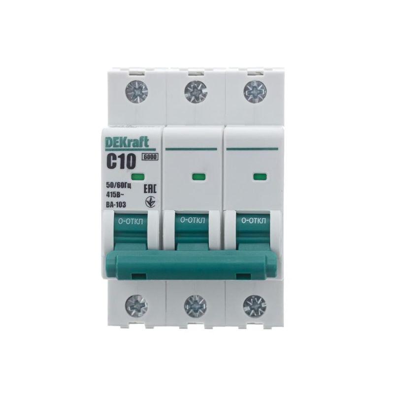 Автоматический выключатель серии ВА-103 NEW Dekraft; 3P; номинальный ток 10 А; характеристика C; отключающая способность 6 кА, что позволяет использовать аппараты в качестве вводных. 5 монолитных заклепок повышают прочность корпуса аппарата. Окошко-индикатор всегда показывает состояние контактов вне зависимости от положения рукоятки управления. Боковые каналы охлаждения повышают стабильность работы при высоких температурах окружающей среды. Есть возможность установки дополнительных аксессуаров с левой стороны устройства. Аппарат на 100% совместим с корпусами и оболочками Dekraft, Systeme Electric.