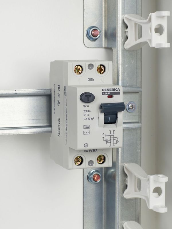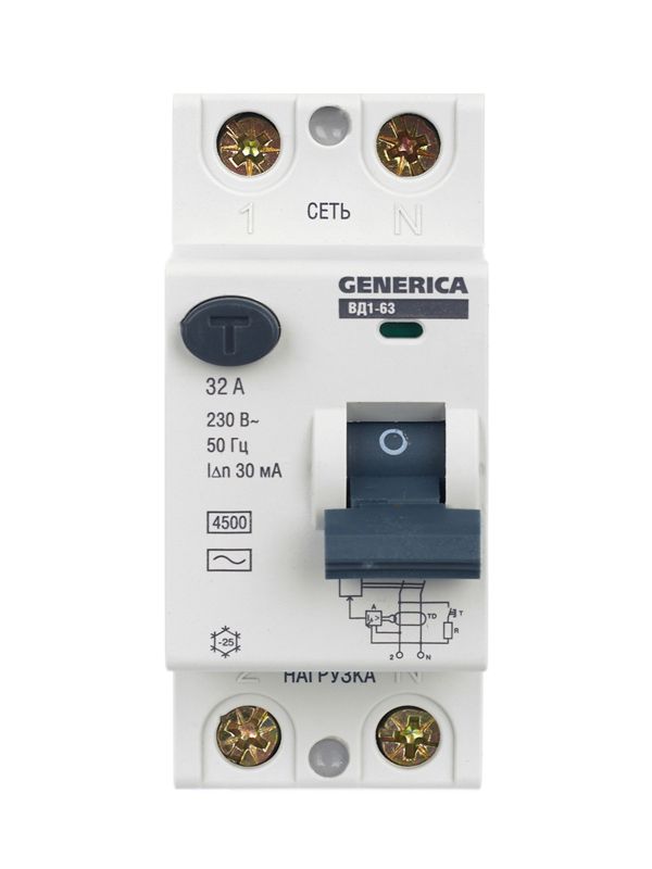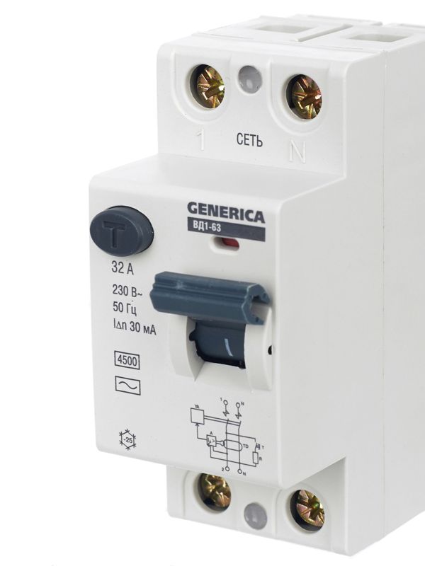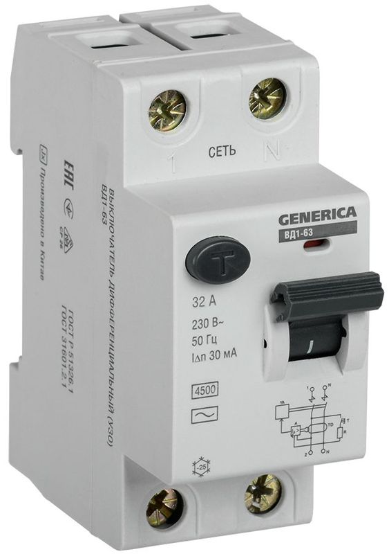 Быстродействующий защитный выключатель ВД1-63 (УЗО) GENERICA - устройство электронного типа, зависящее от напряжения и реагирующее на дифференциальный ток, без встроенной защиты от сверхтоков. Предназначен для защиты человека от поражения электрическим током.