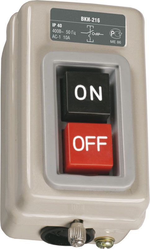 Выключатели кнопочные с механической блокировкой серии ВКИ предназначены для нечастых коммутаций одно- и трехфазных нагрузок индуктивного и активного характера (электродвигателей, осветительных и нагревательных приборов). Область применения - управление электрифицированными строительными машинами и механизмами (бетономешалки малых объемов, электроинструмент, цепи временного и уличного освещения, в том числе люминесцентного, мобильные тепловентиляторы, насосы, компрессоры и т.д.). По своим конструктивным и техническим характеристикам выключатели кнопочные серии ВКИ соответствуют требованиям международных и российских стандартов МЭК 60947-4-1-2000, ГОСТ Р50030.4.1-2002. Выключатели кнопочные серии ВКИ прошли сертификационные испытания и на их серийный выпуск получен сертификат соответствия РОСС CN.ME86.B00174.